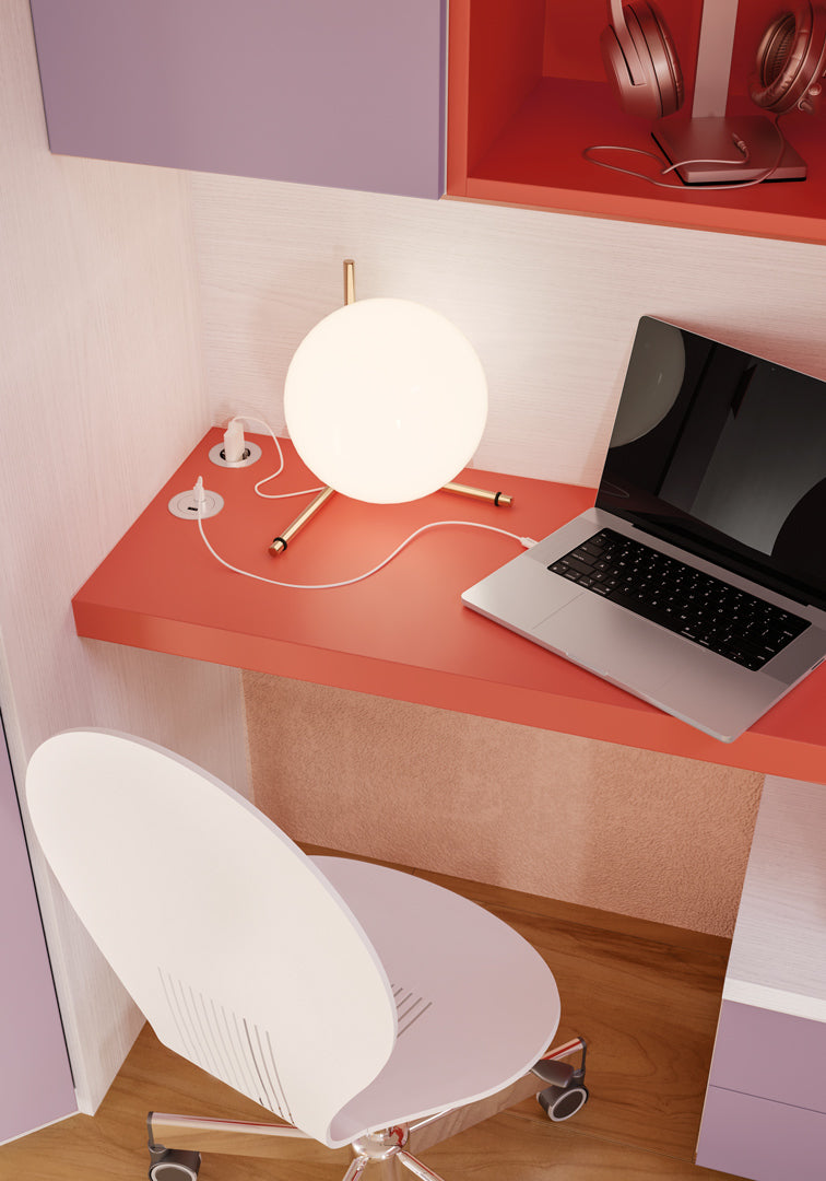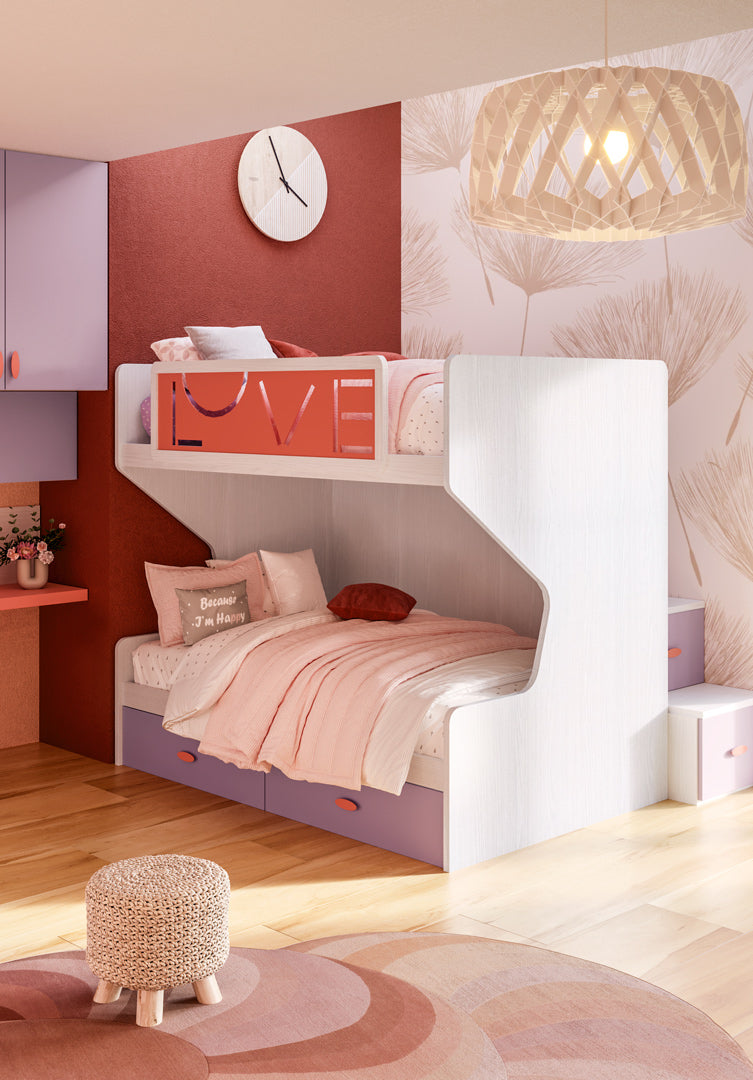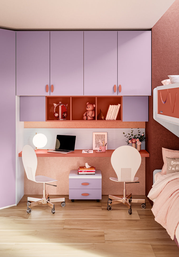 Cameretta per giovani romantiche, con letto a castello da una piazza e mezza, armadio battente con cabina ad angolo, libreria angolare e scrivania sospesa.