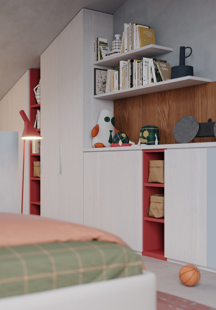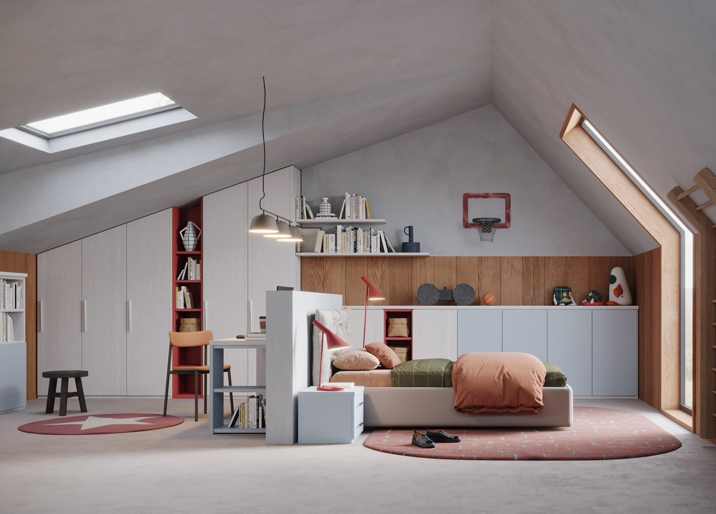 Colori vivaci interrompono la monotonia dei colori tenui in una cameretta per ragazzi, con armadio battente mansardato per sfruttare tutto lo spazio in altezza.