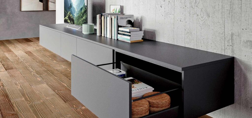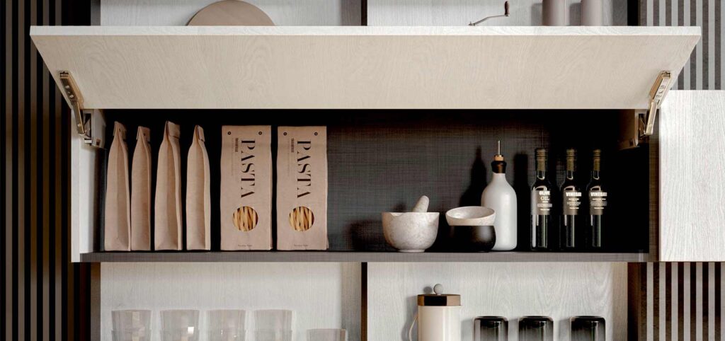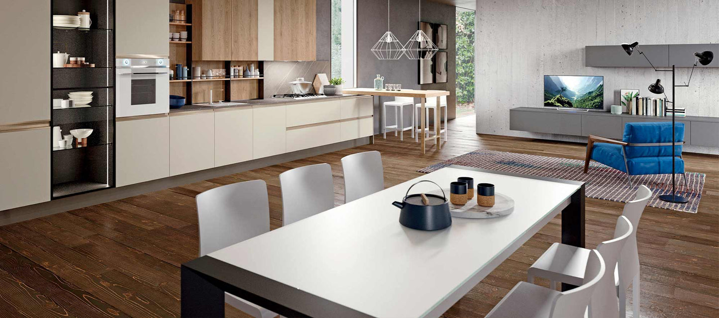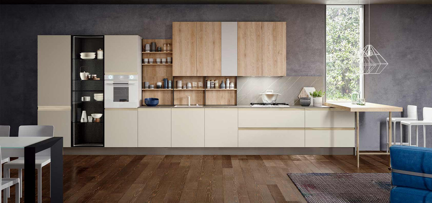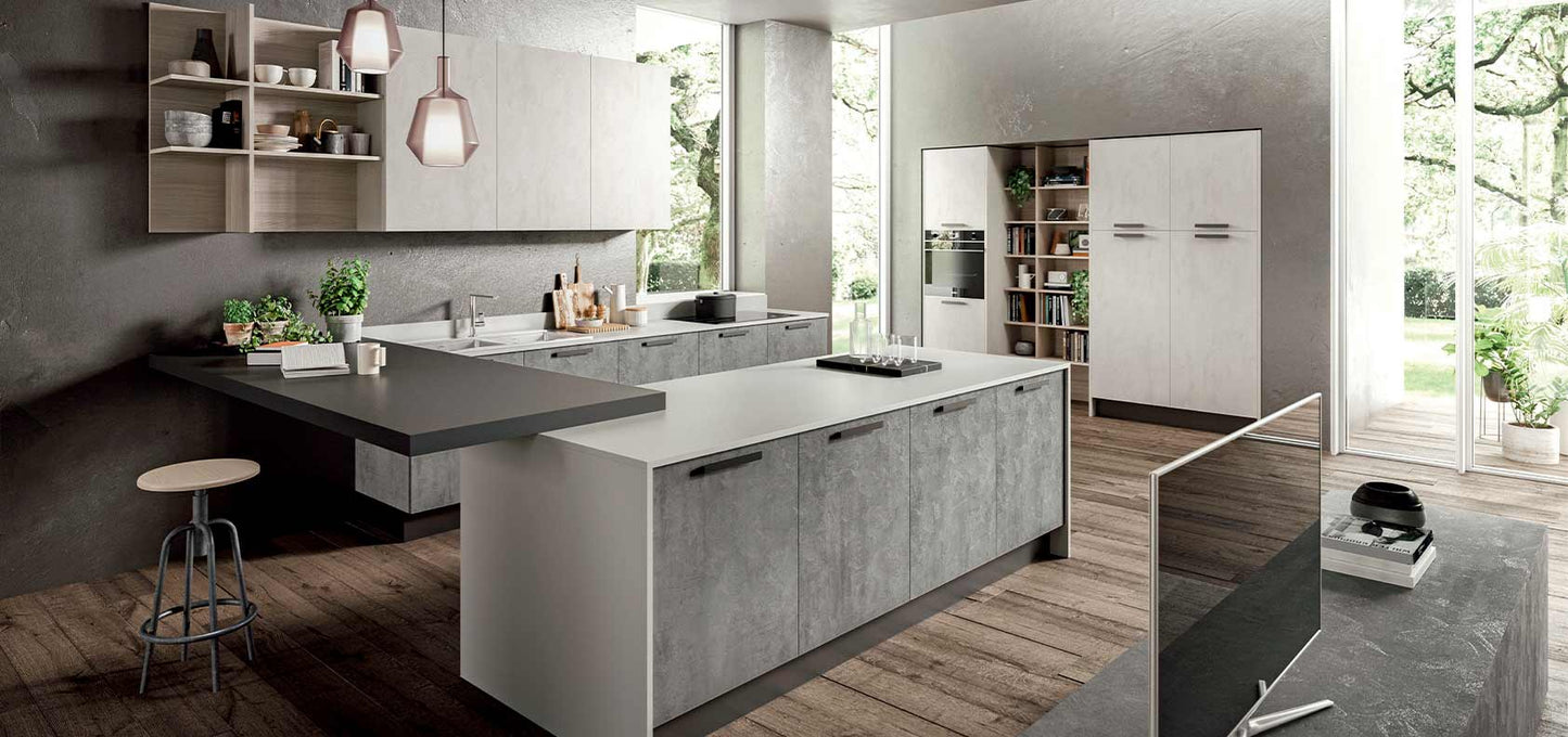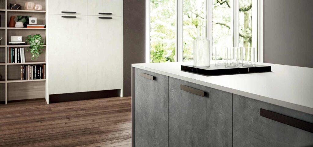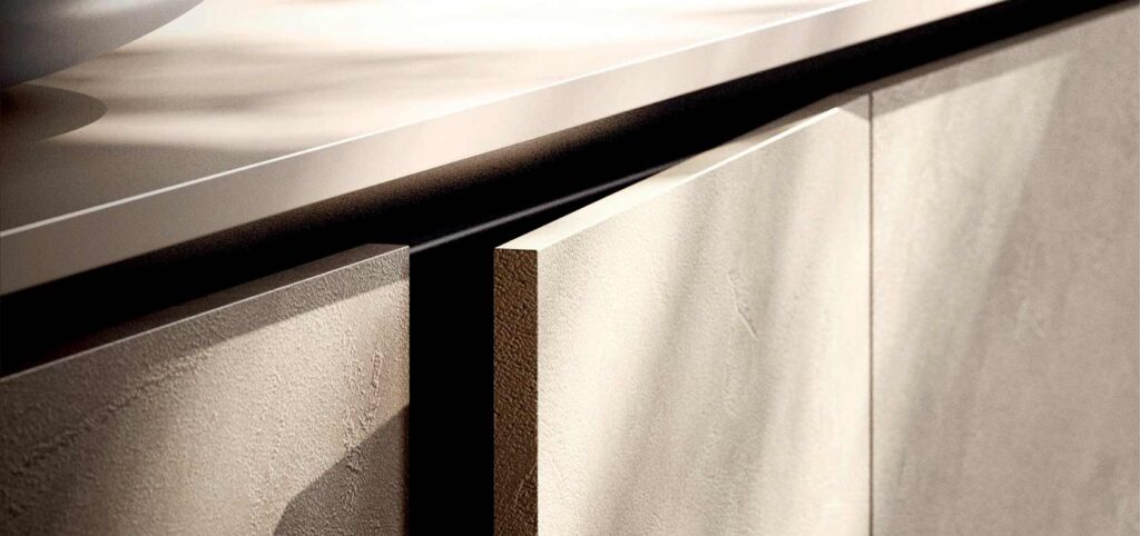Un sorprendente mix di texture in una cucina estremamente lineare. Linee rigorose si intersecano per creare una geometria sobria ed essenziale, senza rinunciare alla funzionalità.
